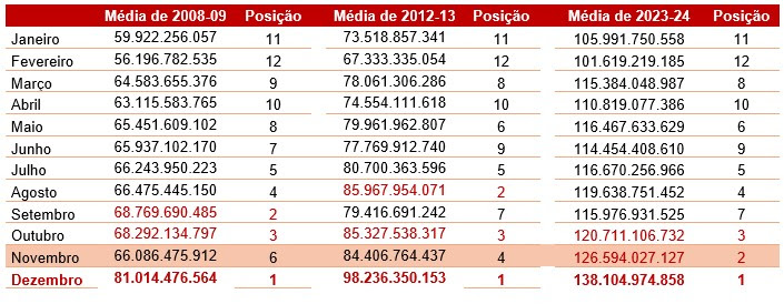 Da mesma forma, se em 2008 a diferença das receitas desses segmentos entre os meses de novembro e dezembro era de 5,3 p.p., no ano passado ela foi de 0,3 p.p. — o que indica que, a cada ano, o penúltimo mês do ano tem se tornado tão importante quanto o período do Natal.