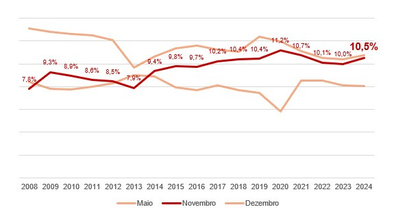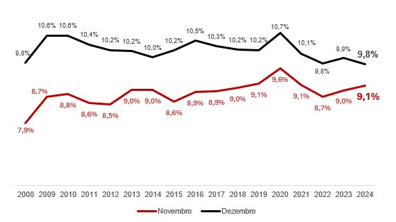 Nesse interim, em paralelo, a proporção das receitas de dezembro no total anual foi perdendo fôlego. Em 2024, o faturamento do mês representou 9,8% do total das receitas do setor, diferença de 0,7 ponto porcentual (p.p.) para novembro.